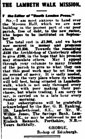 Months later, in August 1910, the Bishop of Edinburgh (and Rector of Lambeth) wrote a letter to The South London Press detailing the thinking behind the new Mission Hall and requesting donations towards the cost.
